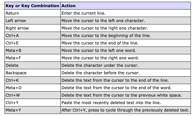Keyboard keys and key combinations provide line editing shortcuts. The Ctrl key and Meta key are used in key combinations.